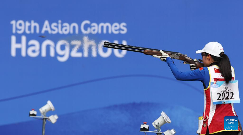 Jiang Yiting of China competes during the Phase 1 of Women's Team of Skeet-75 at the 19th Asian Games in Hangzhou, east China's Zhejiang Province, Sept. 26, 2023. (Xinhua/Du Xiaoyi)