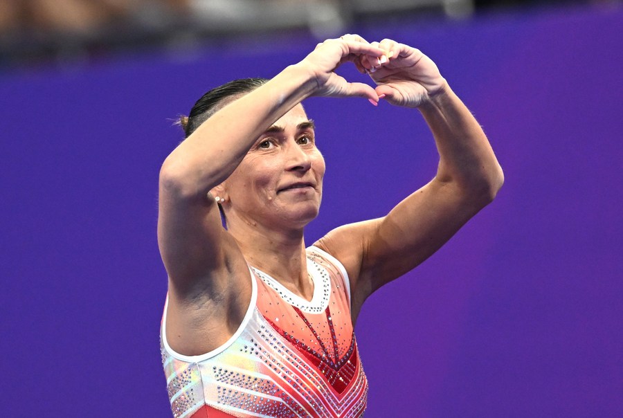 Oksana Chusovitina of Uzbekistan acknowledges the spectators after competing in the Vault of Artistic Gymnastics Women's Qualifications and Team Finals at the 19th Asian Games in Hangzhou, east China's Zhejiang Province, Sept. 25, 2023. (Xinhua/Cheng Min)