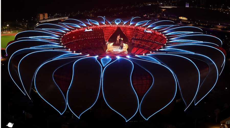 This photo shows a view of the Hangzhou Olympic Sports Center Stadium during the opening ceremony of the 19th Asian Games in Hangzhou, east China's Zhejiang Province, Sept. 23, 2023. (Xinhua/Cheng Tingting)