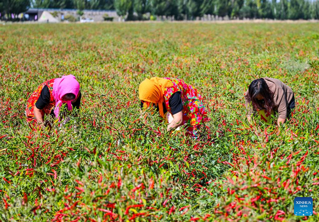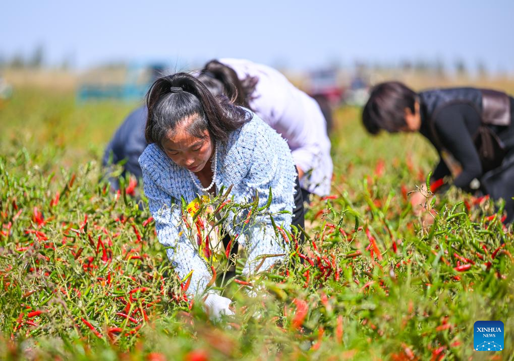 Competitors take part in a chili pepper collecting contest during a harvest festival in Balagong Town of Hangjin Banner, north China's Inner Mongolia Autonomous Region, Sept. 26, 2023. The chili pepper harvest festival was held here on Tuesday, featuring cultural performances, agricultural specialties promotion and contests of chili pepper collecting and chili pepper eating. (Xinhua/Peng Yuan)