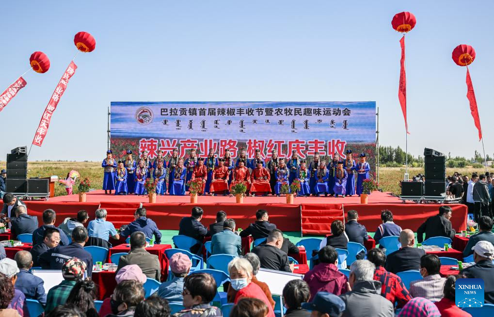 Mongolian people perform during a harvest festival in Balagong Town of Hangjin Banner, north China's Inner Mongolia Autonomous Region, Sept. 26, 2023. The chili pepper harvest festival was held here on Tuesday, featuring cultural performances, agricultural specialties promotion and contests of chili pepper collecting and chili pepper eating. (Xinhua/Peng Yuan)