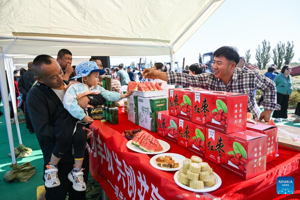 Tourists taste watermelon at an agricultural specialties showcasing area during a harvest festival in Balagong Town of Hangjin Banner, north China's Inner Mongolia Autonomous Region, Sept. 26, 2023. The chili pepper harvest festival was held here on Tuesday, featuring cultural performances, agricultural specialties promotion and contests of chili pepper collecting and chili pepper eating. (Xinhua/Peng Yuan)