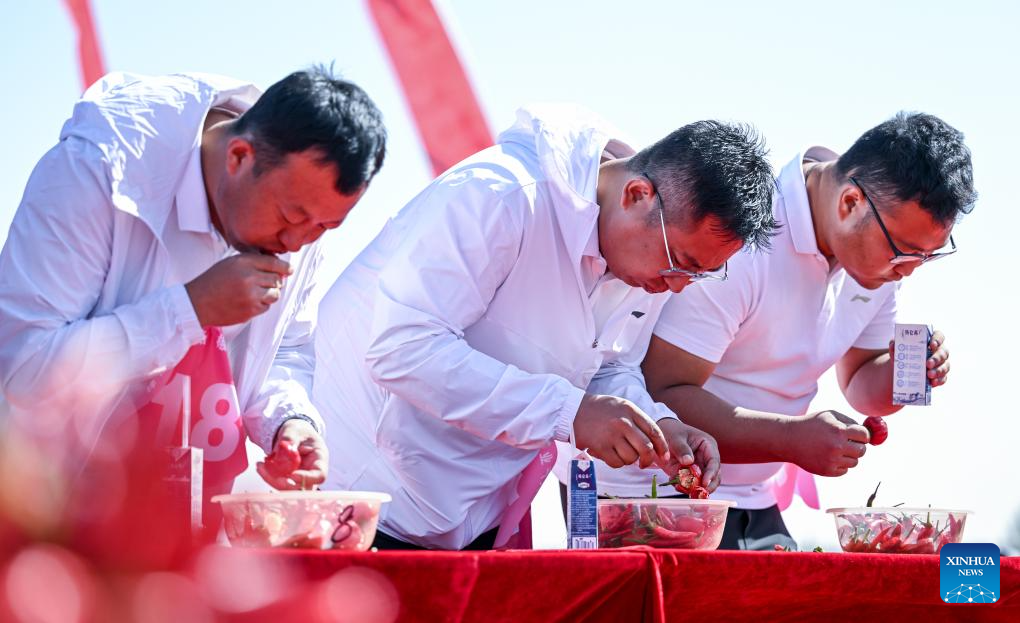 Competitors take part in a chili pepper eating contest during a harvest festival in Balagong Town of Hangjin Banner of north China's Inner Mongolia Autonomous Region, Sept. 26, 2023. The chili pepper harvest festival was held here on Tuesday, featuring cultural performances, agricultural specialties promotion and contests of chili pepper collecting and chili pepper eating. (Xinhua/Peng Yuan)
