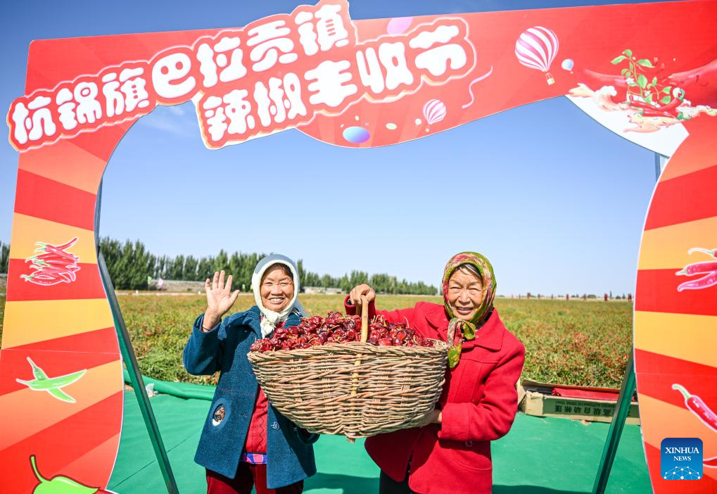 Two farmers pose for a group photo during a harvest festival in Balagong Town of Hangjin Banner, north China's Inner Mongolia Autonomous Region, Sept. 26, 2023. The chili pepper harvest festival was held here on Tuesday, featuring cultural performances, agricultural specialties promotion and contests of chili pepper collecting and chili pepper eating. (Xinhua/Peng Yuan)
