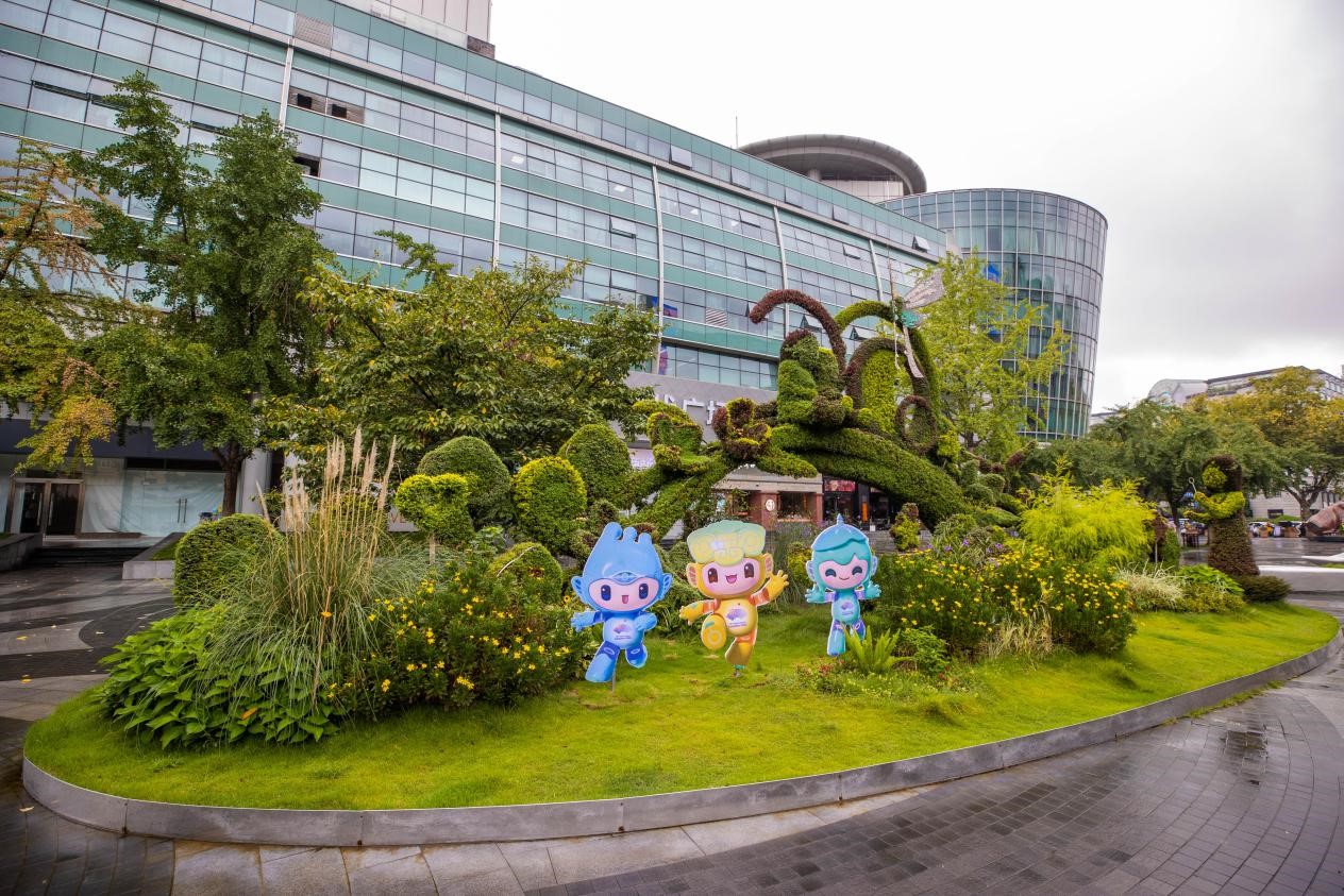 Photo shows a flower bed with the mascots of the Hangzhou Asian Games on Dongpo Road, Hangzhou, east China's Zhejiang province. (People's Daily/Zhang Wujun)