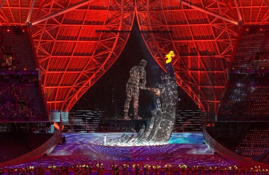 What excited the audiences both inside the stadium and in front of TV sets the most was the moment when Olympic champion swimmer Wang Shun and a digital torchbearer jointly lit the Asian Games cauldron.