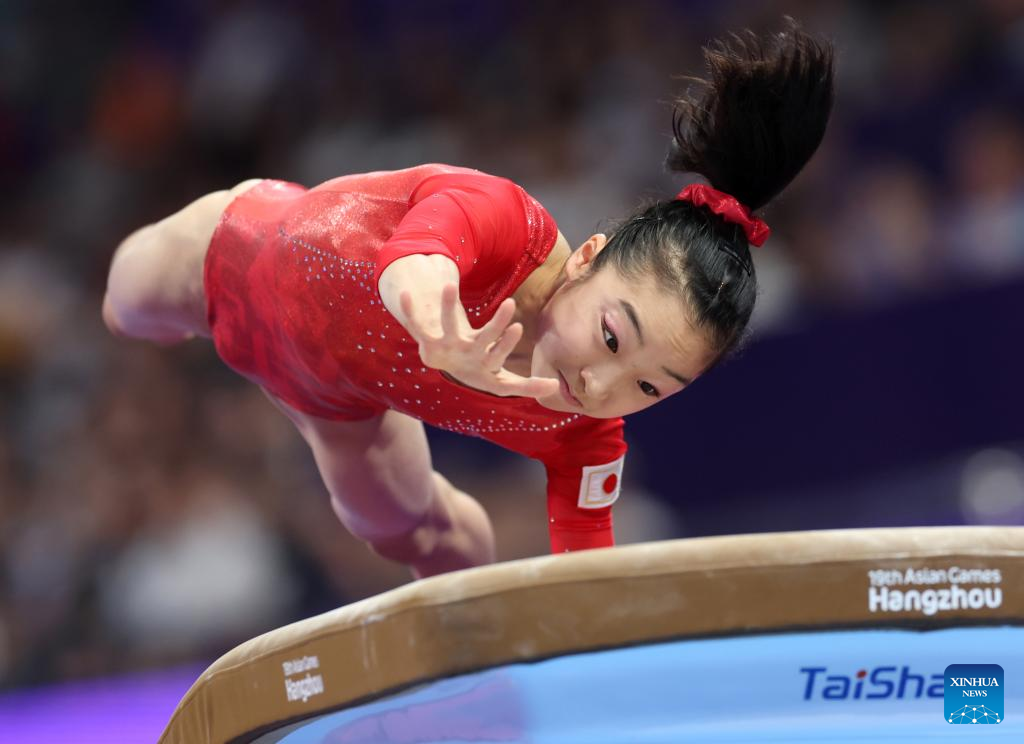Okamura Mana of Japan competes on the vault of the Women's All-round Final of Artistic Gymnastics at the 19th Asian Games in Hangzhou, east China's Zhejiang Province, Sept. 27, 2023. (Xinhua/Cheng Tingting)