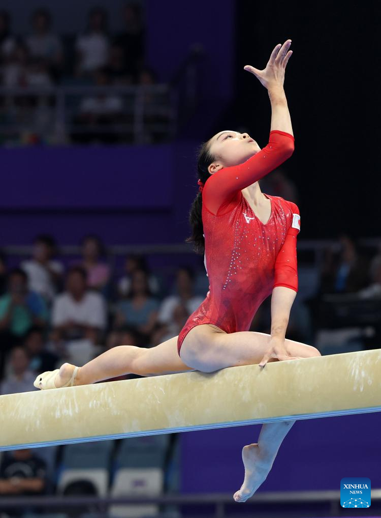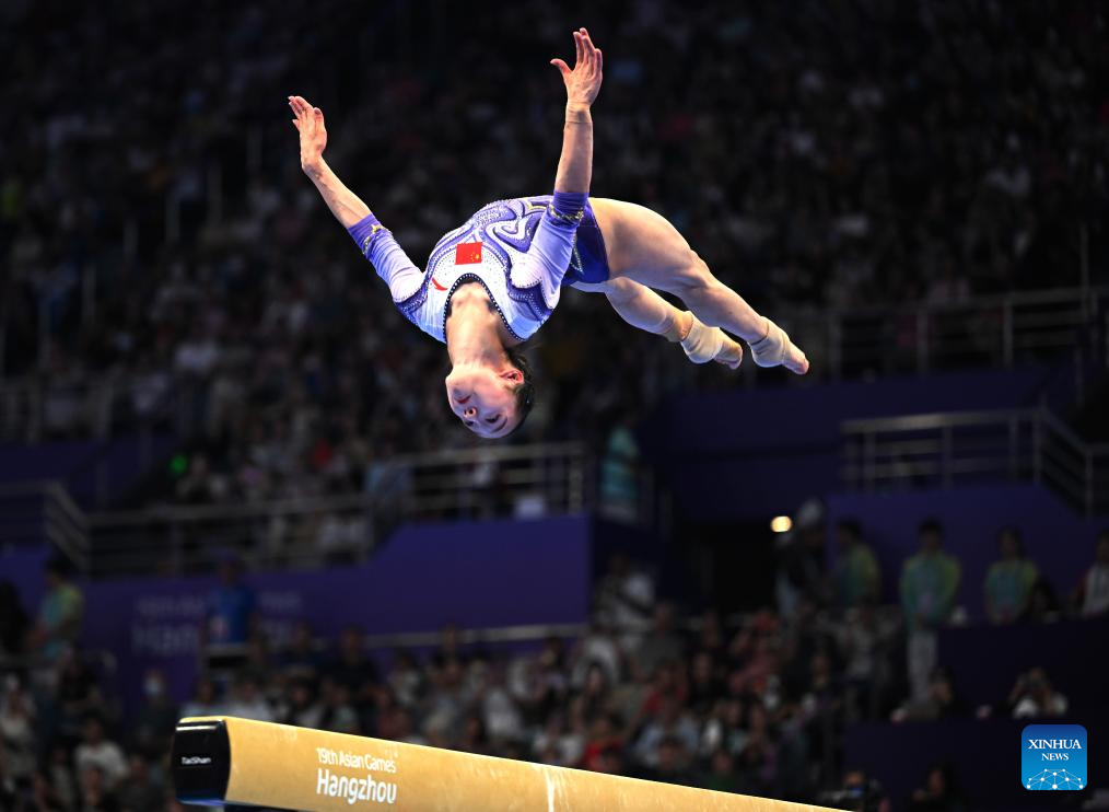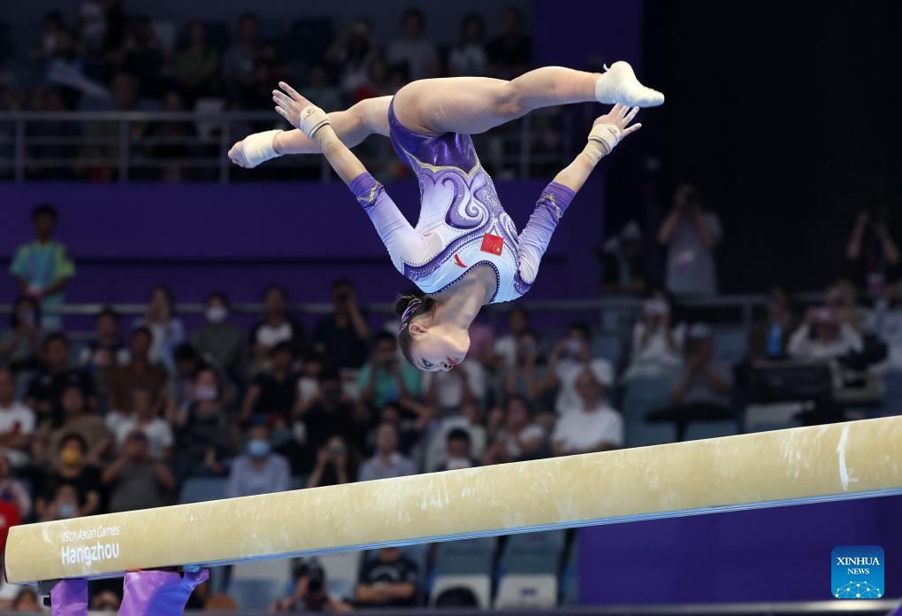 Zhang Jin of China competes on the balance beam of the Women's All-round Final of Artistic Gymnastics at the 19th Asian Games in Hangzhou, east China's Zhejiang Province, Sept. 27, 2023. (Xinhua/Cheng Min)