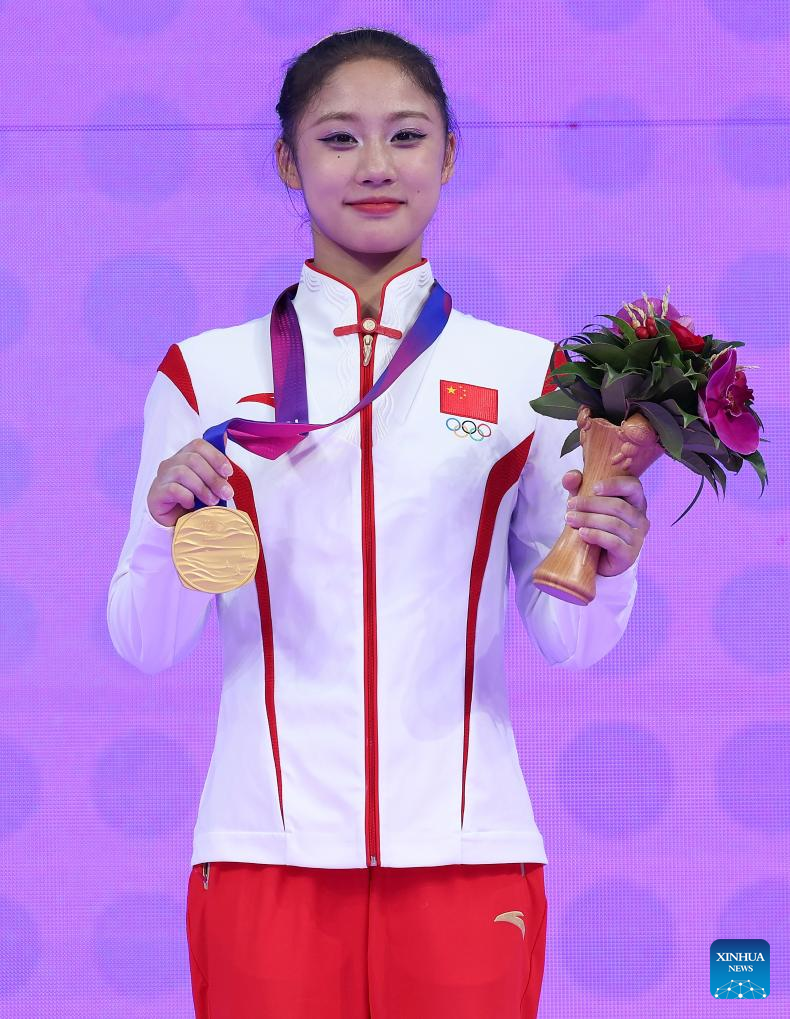 Gold medalist Zuo Tong of China is pictured during the awarding ceremony for the Women's All-Around of Artistic Gymnastics at the 19th Asian Games in Hangzhou, east China's Zhejiang Province, Sept. 27, 2023. (Xinhua/Cheng Tingting)