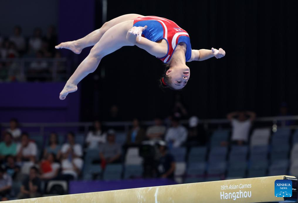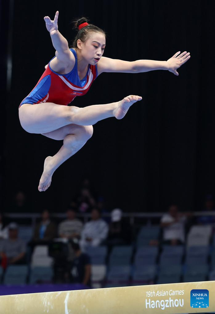 Kim Sujong of the Democratic People's Republic of Korea (DPRK) competes on the balance beam of the Women's All-round Final of Artistic Gymnastics at the 19th Asian Games in Hangzhou, east China's Zhejiang Province, Sept. 27, 2023. (Xinhua/Cheng Tingting)