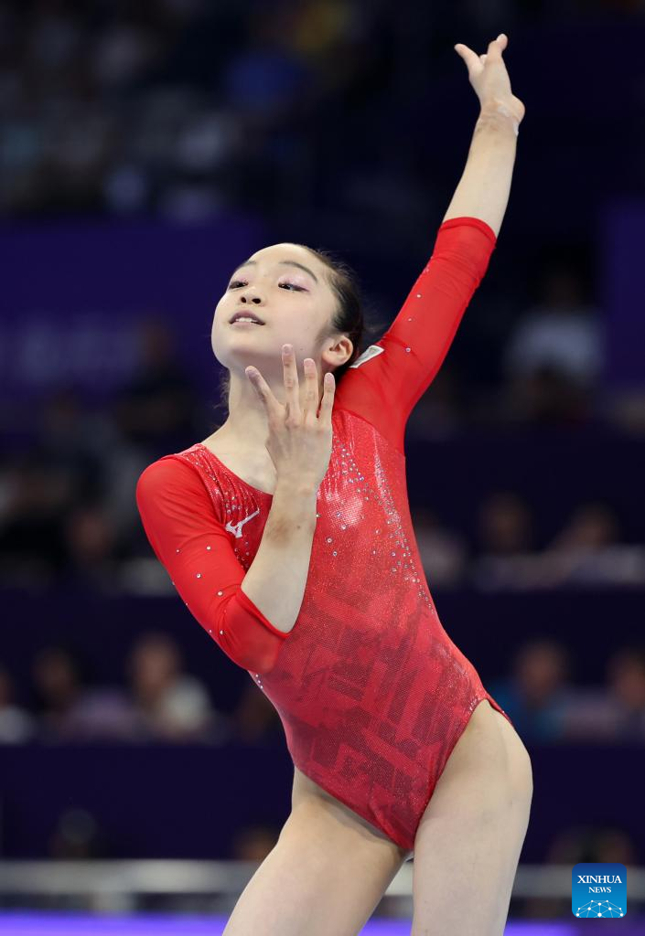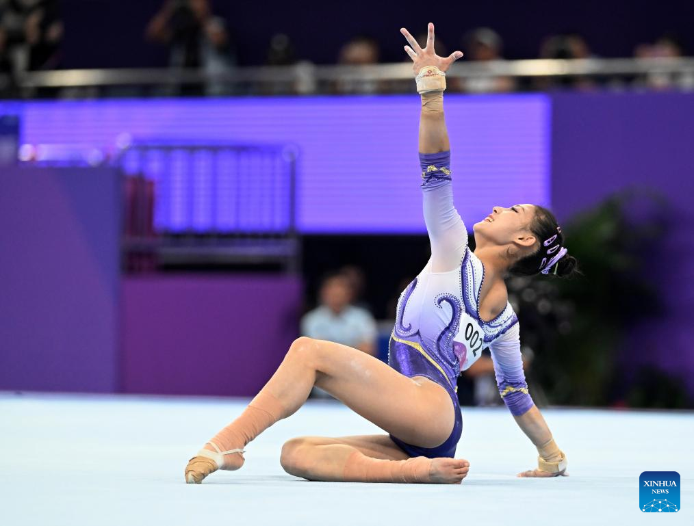 Okamura Mana of Japan competes on the floor exercise of the Women's All-round Final of Artistic Gymnastics at the 19th Asian Games in Hangzhou, east China's Zhejiang Province, Sept. 27, 2023. (Xinhua/Cheng Tingting)