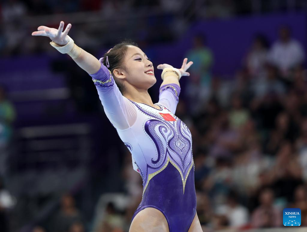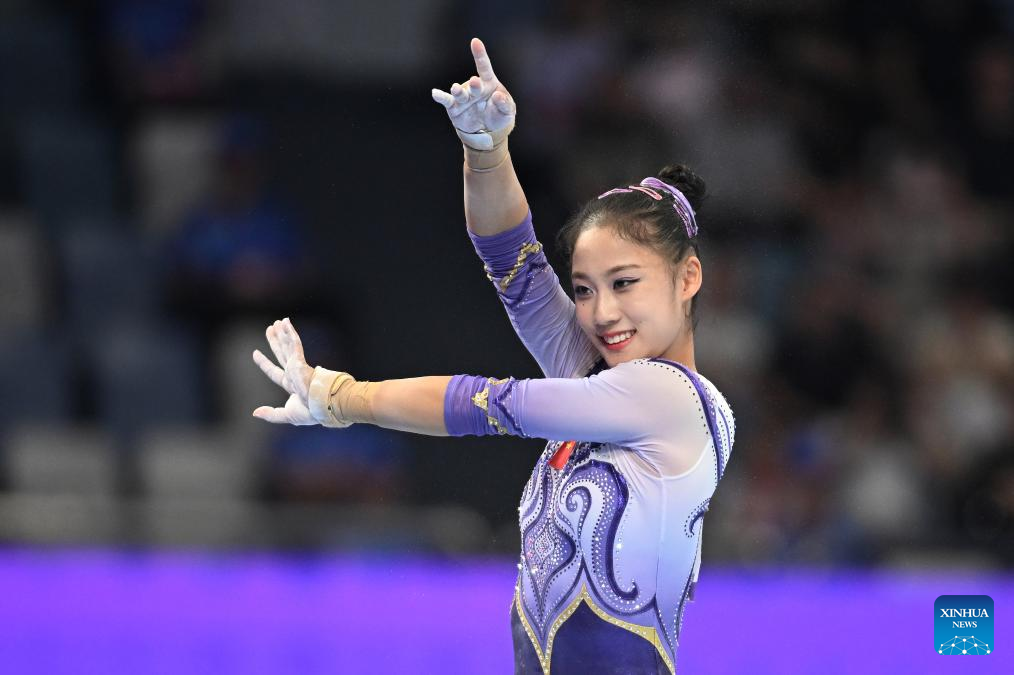 Zuo Tong of China gestures to spectators after the Floor exercise of the Women's All-Around Final of Artistic Gymnastics at the 19th Asian Games in Hangzhou, east China's Zhejiang Province, Sept. 27, 2023. (Xinhua/Cheng Tingting)