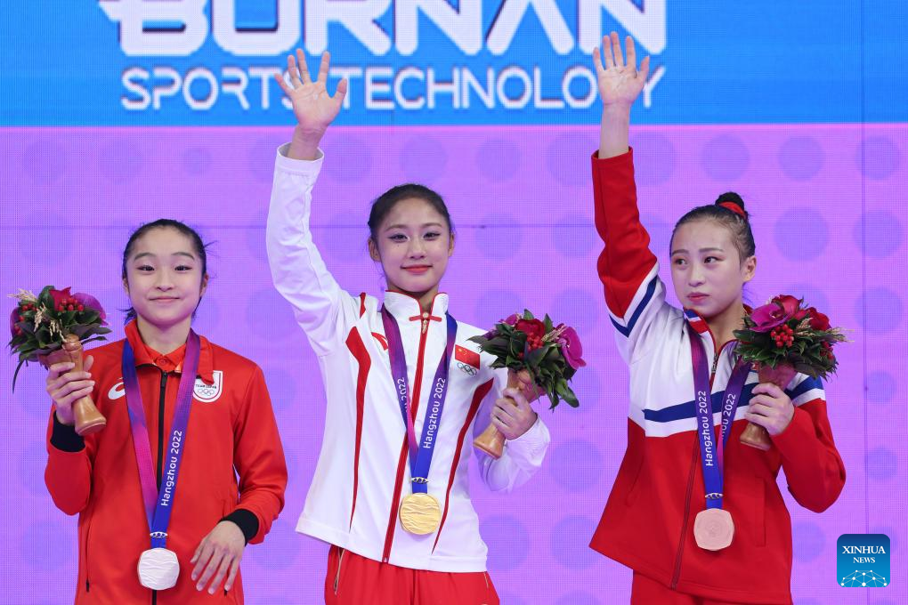 Gold medalist Zuo Tong (C) of China, silver medalist Okamura Mana of Japan (L) and Kim Sujong of the Democratic People's Republic of Korea (DPRK) during the awarding ceremony for the Women's All-Around of Artistic Gymnastics at the 19th Asian Games in Hangzhou, east China's Zhejiang Province, Sept. 27, 2023. (Xinhua/Cheng Tingting)