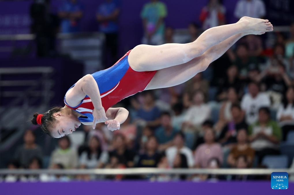 Kim Sujong of the Democratic People's Republic of Korea (DPRK) competes on the floor exercise of the Women's All-round Final of Artistic Gymnastics at the 19th Asian Games in Hangzhou, east China's Zhejiang Province, Sept. 27, 2023. (Xinhua/Cheng Tingting)