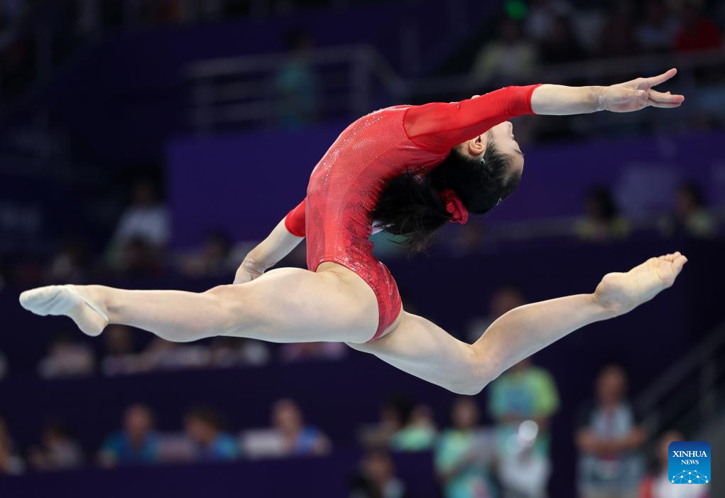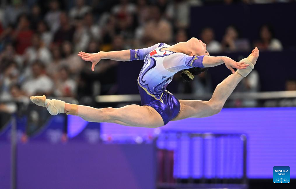 Zhang Jin of China competes on the floor exercise of the Women's All-round Final of Artistic Gymnastics at the 19th Asian Games in Hangzhou, east China's Zhejiang Province, Sept. 27, 2023. (Xinhua/Cheng Min)