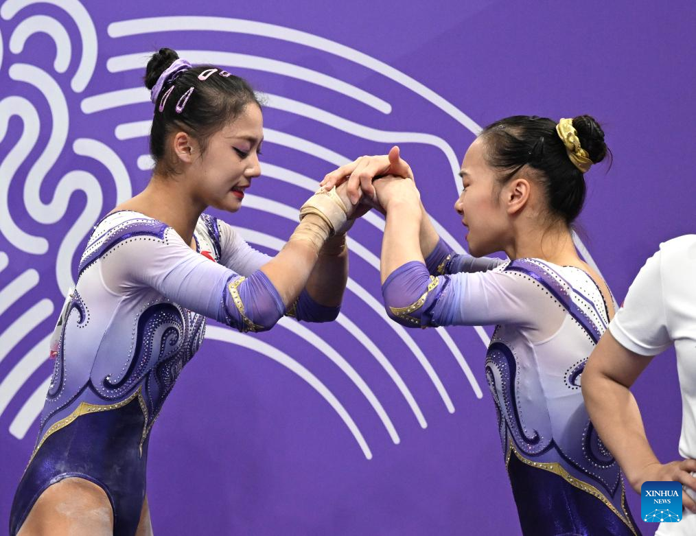 Zuo Tong (L)/Zhang Jin of China cheer for each other after the Balance Beam of the Women's All-Around Final of Artistic Gymnastics at the 19th Asian Games in Hangzhou, east China's Zhejiang Province, Sept. 27, 2023. (Xinhua/Cheng Min)