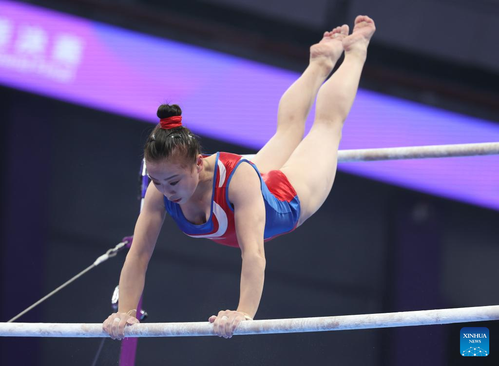 Kim Sujong of the Democratic People's Republic of Korea (DPRK) competes on uneven bars of the Women's All-round Final of Artistic Gymnastics at the 19th Asian Games in Hangzhou, east China's Zhejiang Province, Sept. 27, 2023. (Xinhua/Cheng Tingting)