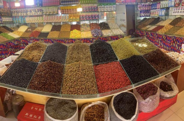 Photo shows various kinds of dried products at the fruit industry agricultural product trading center in Aksu Prefecture, northwest China's Xinjiang Uygur Autonomous Region. (People's Daily/Zhang Yizhao)