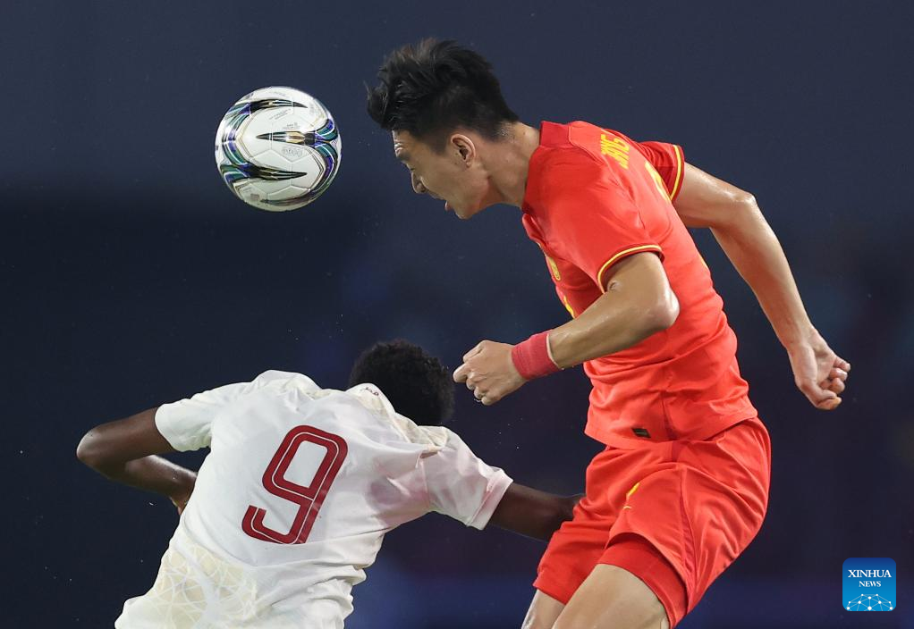 Jiang Shenglong (R)of China competes during the Men's round of 16 match of Football between China and Qatar at the 19th Asian Games in Hangzhou, east China's Zhejiang Province, Sept. 27, 2023. (Xinhua/Jia Haocheng)