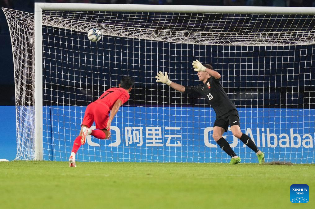 Jeong Wooyeong of South Korea scores with a header during the Football Men's Round of 16 Match between South Korea and Kyrgyzstan at the 19th Asian Games in Jinhua, east China's Zhejiang Province, Sept. 27, 2023. (Xinhua/Chen Zhonghao)