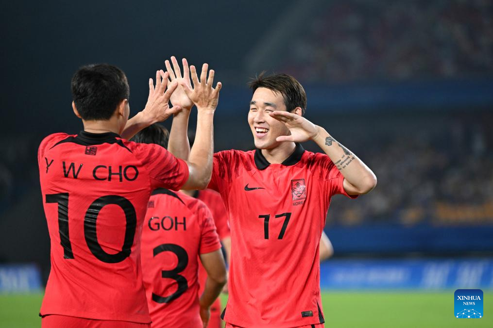 Kim Taehyeon (R) of South Korea celebrates during the Football Men's Round of 16 Match between South Korea and Kyrgyzstan at the 19th Asian Games in Jinhua, east China's Zhejiang Province, Sept. 27, 2023. (Xinhua/Chen Zhonghao)