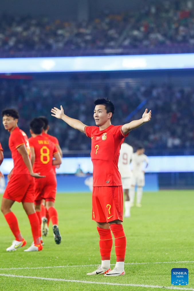 Tao Qianglong (R)of China celebrates scoring during the Men's round of 16 match of Football between China and Qatar at the 19th Asian Games in Hangzhou, east China's Zhejiang Province, Sept. 27, 2023. (Xinhua/Hu Xingyu)