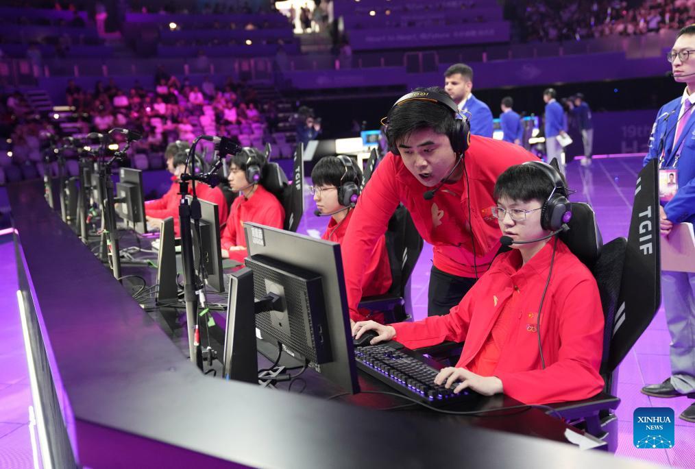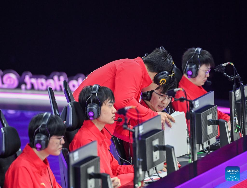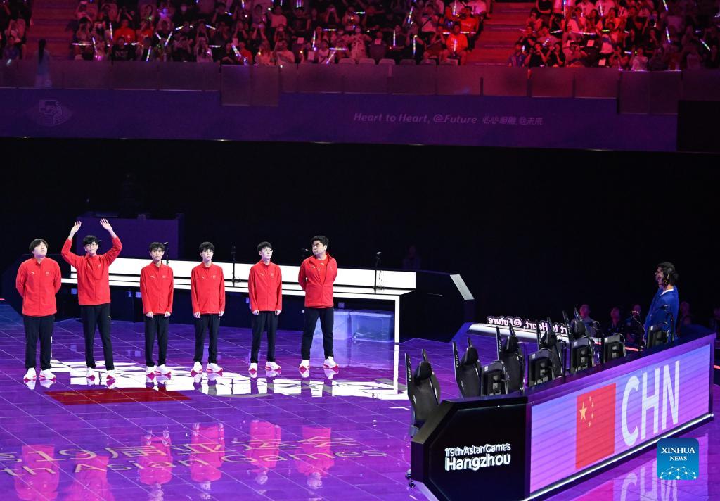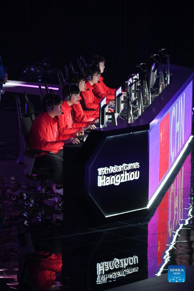 Team China compete during the League of Legends Semifinal of Esports between China and South Korea at the 19th Asian Games in Hangzhou, east China's Zhejiang Province, Sept. 28, 2023. (Xinhua/Han Chuanhao)