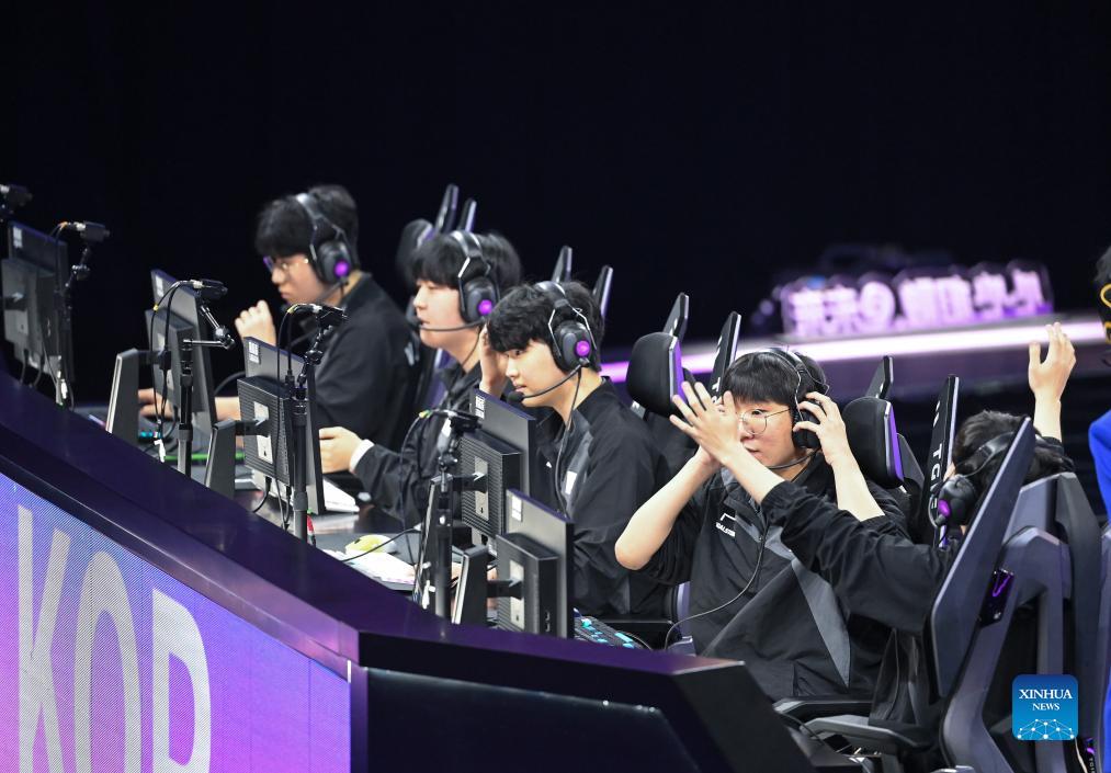 Team China compete during the League of Legends Semifinal of Esports between China and South Korea at the 19th Asian Games in Hangzhou, east China's Zhejiang Province, Sept. 28, 2023. (Xinhua/Yan Linyun)