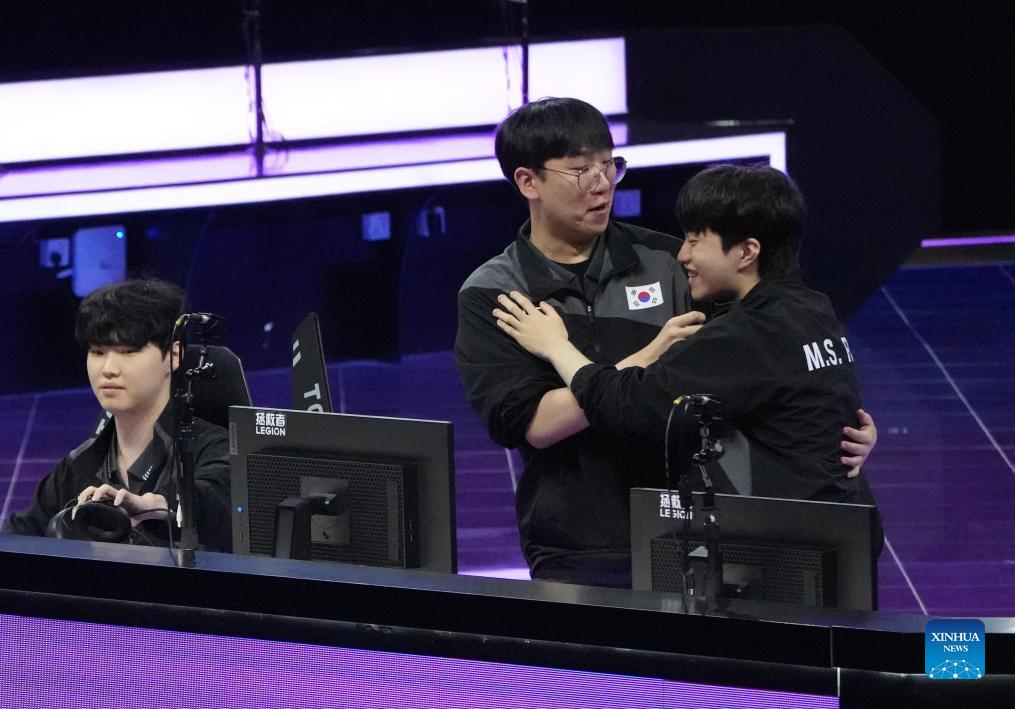 Team South Korea celebrate after the League of Legends Semifinal of Esports between China and South Korea at the 19th Asian Games in Hangzhou, east China's Zhejiang Province, Sept. 28, 2023. (Xinhua/Yan Linyun)