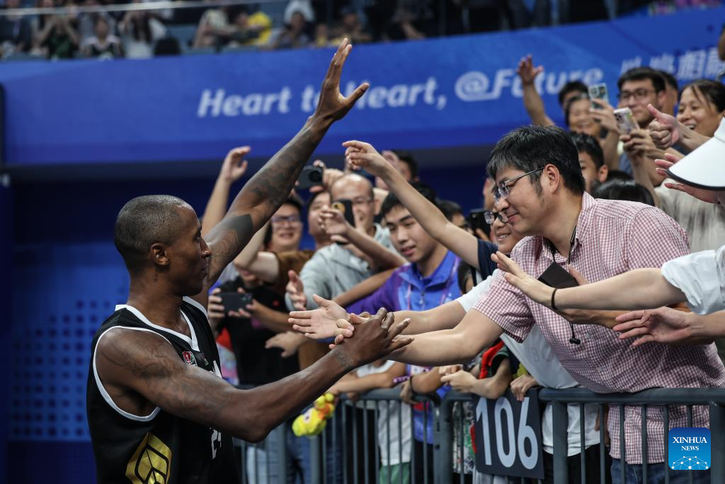 Rondae Jefferson of Jordan shakes hands with spectators after the Men's Preliminary Round Group C match of Basketball between Jordan and Bahrain at the 19th Asian Games in Hangzhou, east China's Zhejiang Province, Sept. 28, 2023. (Xinhua/Pan Yulong)