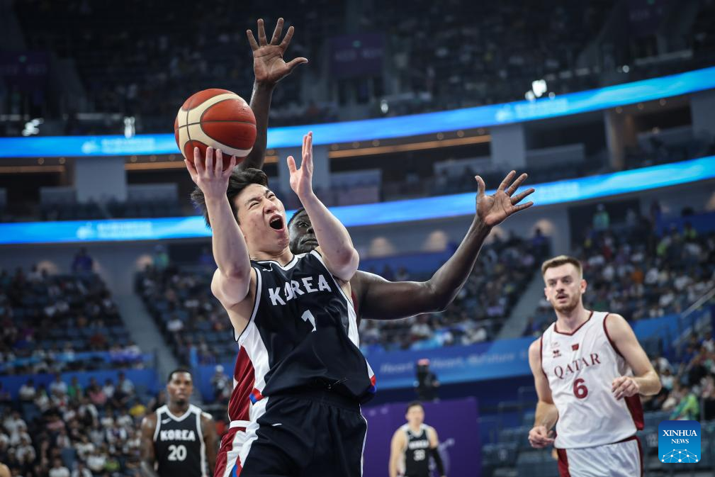 Guna RA (R) of South Korea goes for a layup during the Men's Preliminary Round Group D match of Basketball between South Korea and Qatar at the 19th Asian Games in Hangzhou, east China's Zhejiang Province, Sept. 28, 2023. (Xinhua/Pan Yulong)