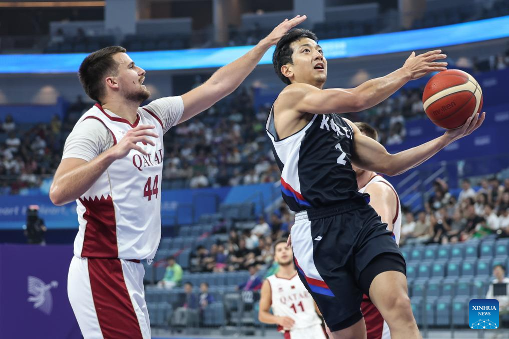 Lee Junghyun (L) of South Korea goes for a layup during the Men's Preliminary Round Group D match of Basketball between South Korea and Qatar at the 19th Asian Games in Hangzhou, east China's Zhejiang Province, Sept. 28, 2023. (Xinhua/Pan Yulong)