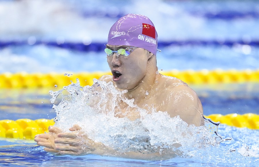Chinese swimmer Qin Haiyang competes in the men's 200m breaststroke final at the 19th Asian Games in Hangzhou, east China's Zhejiang Province on Sept. 28, 2023. (Xinhua/Huang Zongzhi)