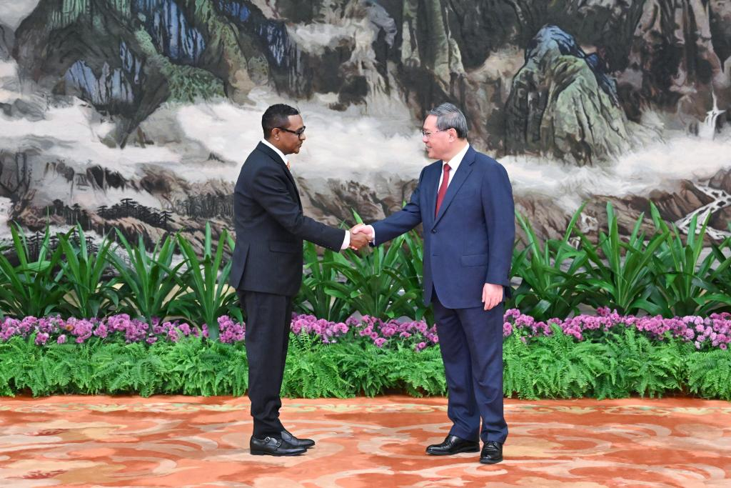 Chinese Premier Li Qiang shakes hands with Tefera Derbew Yimam, Ethiopian ambassador to China, at the Great Hall of the People in Beijing, capital of China, Sept. 28, 2023. Li met with newly appointed diplomatic envoys and representatives stationed in China from 52 countries and international organizations at the Great Hall of the People in Beijing on Thursday. (Xinhua/Yue Yuewei)