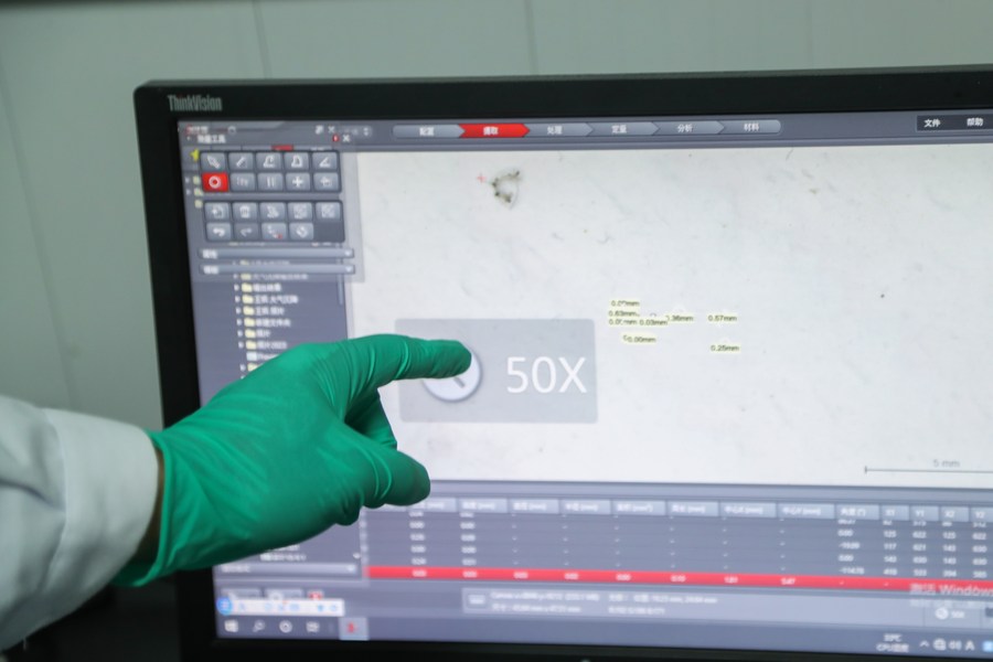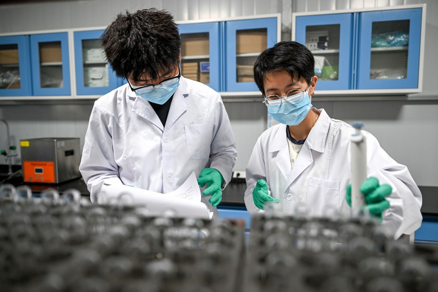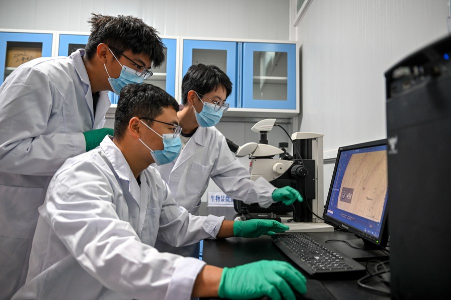Wu Rong and her fellow students study water samples taken from the Ulan Suhai Lake at a laboratory in Bayannur, north China's Inner Mongolia Autonomous Region, Sept. 14, 2023. (Xinhua/Wang Kaiyan)