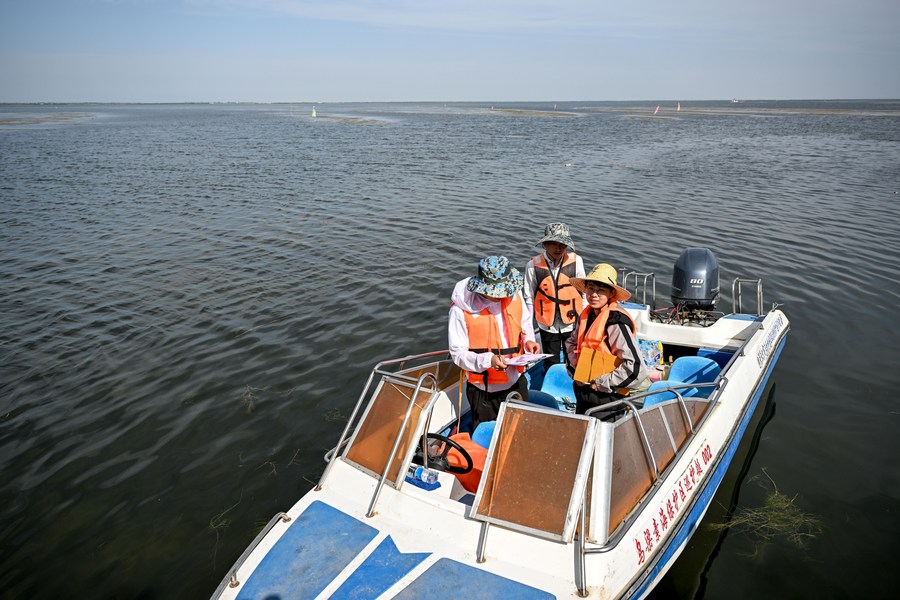 Wu Rong (R) and team members Feng Chen (L) and Liu Yinghui take a yacht to collect water samples from the Ulan Suhai Lake in Bayannur, north China's Inner Mongolia Autonomous Region, Sept. 15, 2023. (Xinhua/Lian Zhen)