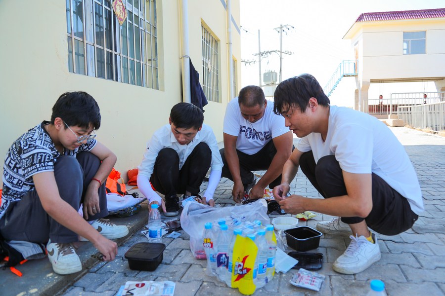 Team members have lunch after collecting water samples from the Ulan Suhai Lake in Bayannur, north China's Inner Mongolia Autonomous Region, Sept. 15, 2023.(Xinhua/Wang Kaiyan)