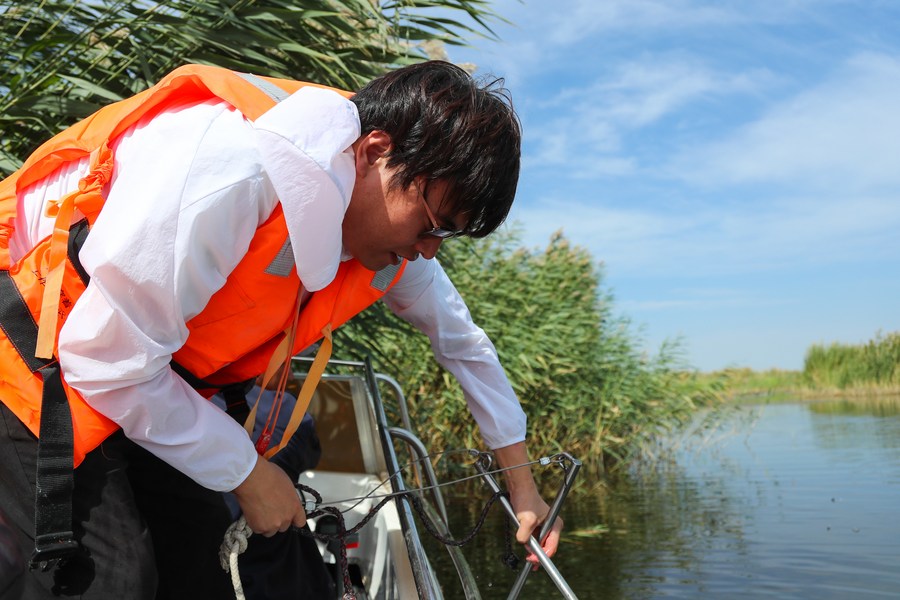 Team member Feng Chen collects mud samples from the bottom of the Ulan Suhai Lake in Bayannur, north China's Inner Mongolia Autonomous Region, Sept. 15, 2023. (Xinhua/Wang Kaiyan)