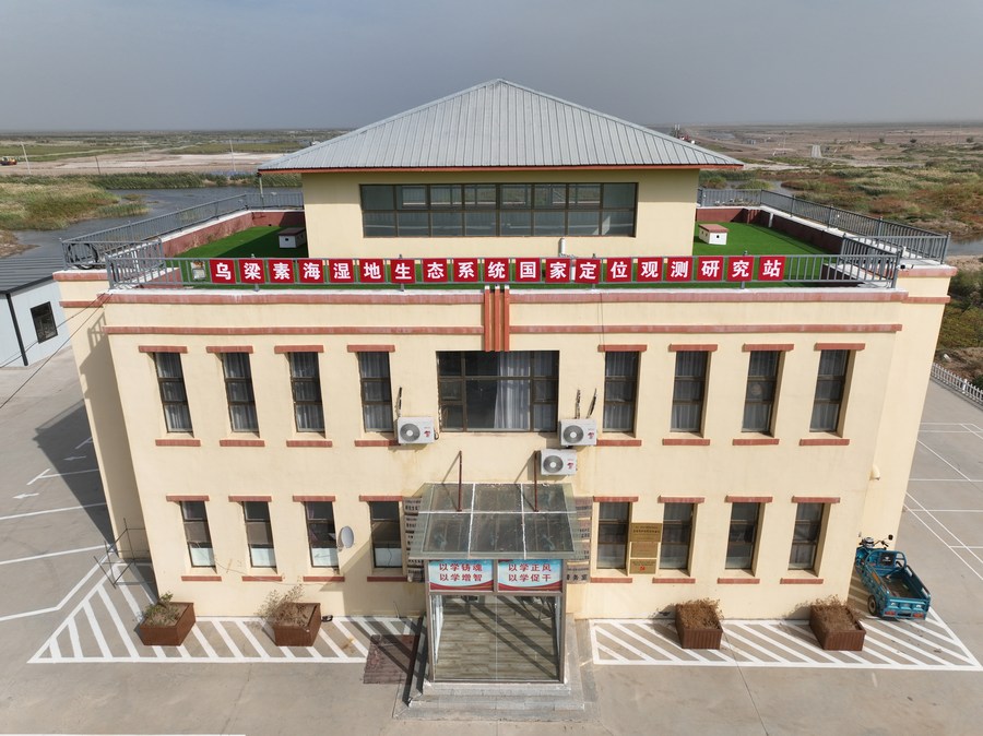 This aerial photo taken on Sept. 14, 2023 shows an observation station of the Ulan Suhai Lake in Bayannur, north China's Inner Mongolia Autonomous Region. (Xinhua/Xing Guangli)