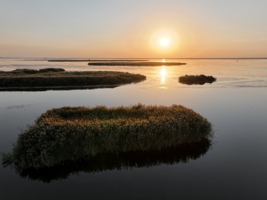 This aerial photo taken on Sept. 13, 2023 shows a scenery of sunset at the Ulan Suhai Lake in Bayannur, north China's Inner Mongolia Autonomous Region. (Xinhua/Xing Guangli)