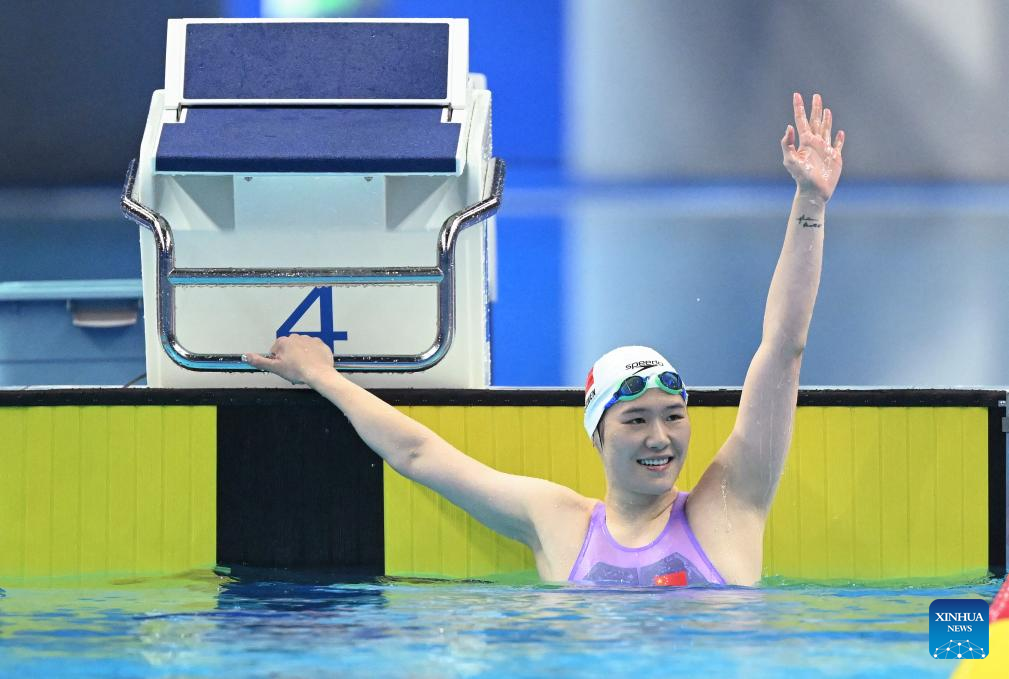 Ye Shiwen of China reacts after the Women's 200m Breaststroke Final of Swimming at the 19th Asian Games in Hangzhou, east China's Zhejiang Province, Sept. 28, 2023. (Xinhua/Xue Yuge)