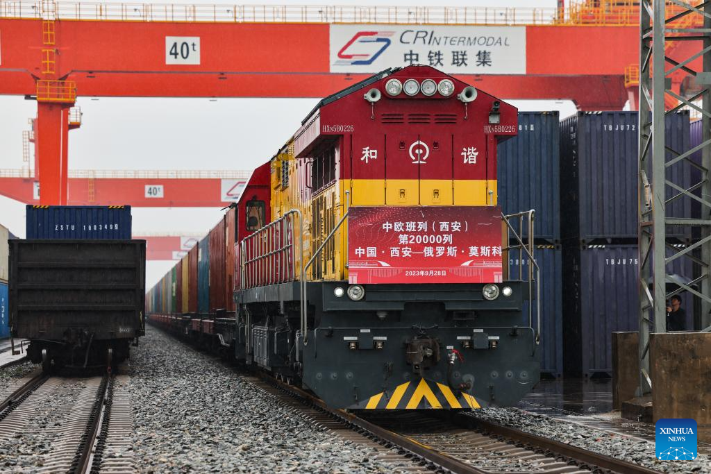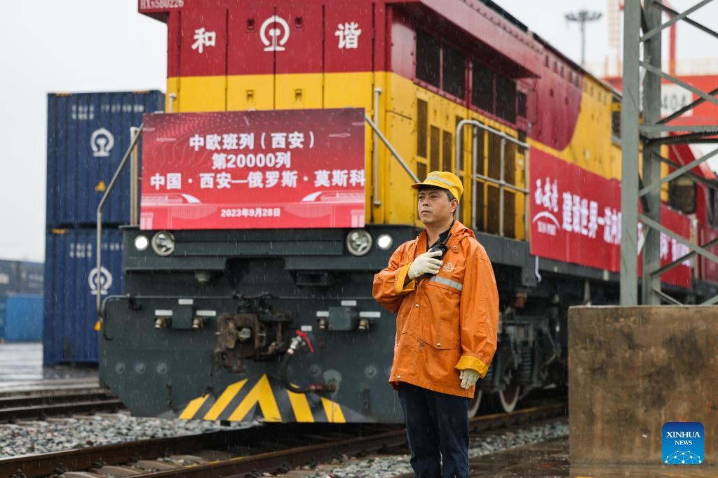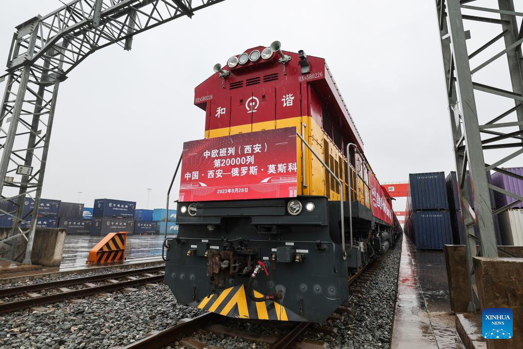 XI'AN, Sept. 28 (Xinhua) -- As of Thursday, the Xi'an international port station has handled a total of 20,000 China-Europe freight trains since the China-Europe freight train (Xi'an) service was launched in 2013.