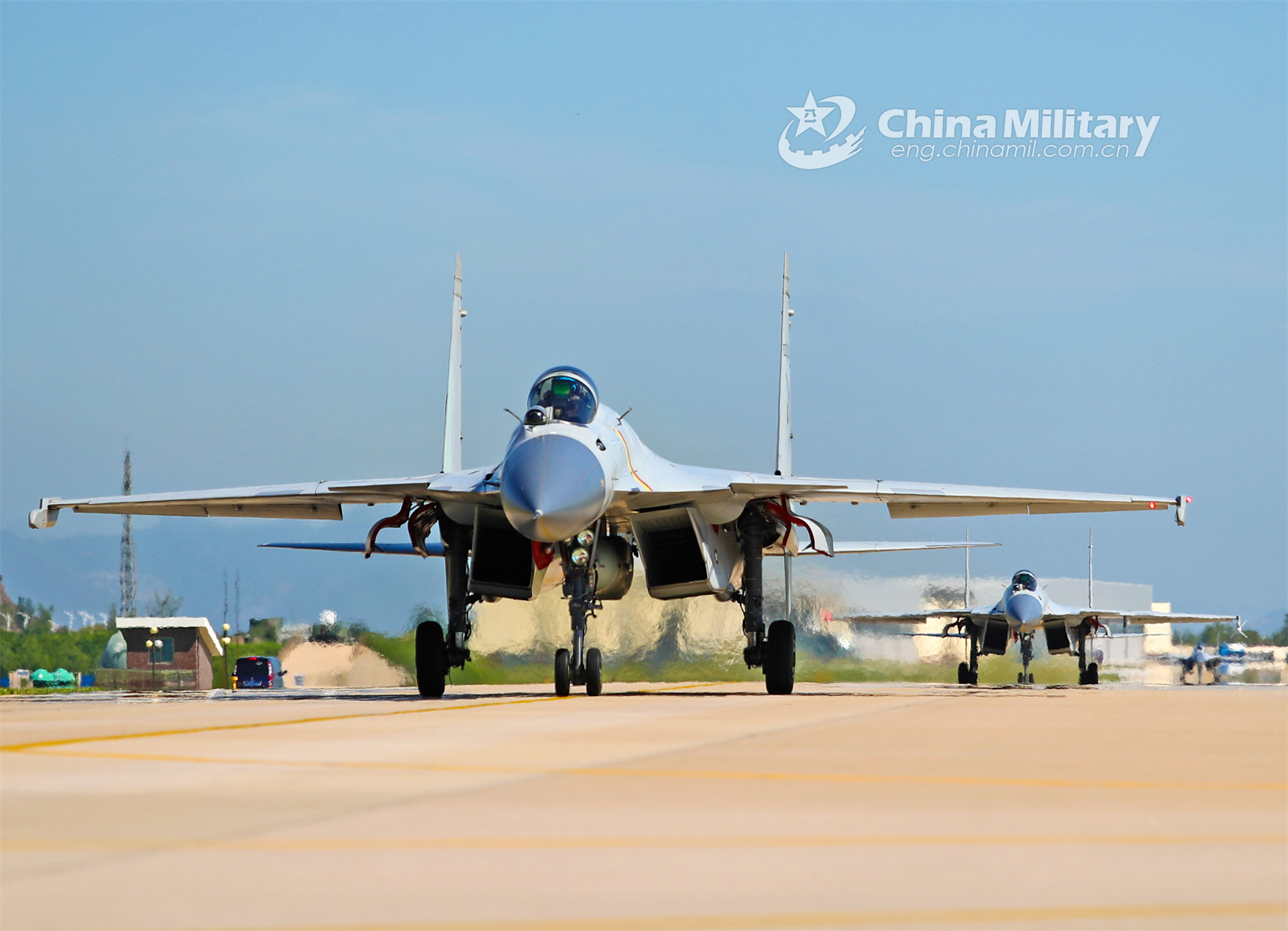 Fighter jets attached to the PLA Naval Aviation University taxi on the flightline in formation before takeoff for a flight training mission on September 16, 2023. (eng.chinamil.com.cn/Photo by Jiang Tao)