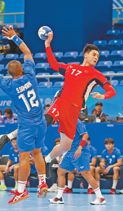 China's Hu Jinming (R) competes in a men's handball group match at the 19th Asian Games on Sept. 24, 2023. (Xinhua/Wang Peng)