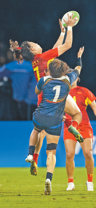 Chinese athletes and a Japanese athlete (front) compete in the final of the Women's Rugby Sevens at the 19th Asian Games on Sept. 26, 2023. (People's Daily/Yi Xiao)