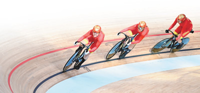 Chinese athletes compete in the women's team sprint track cycling at the 19th Asian Games on Sept. 26, 2023. (People's Daily/Wang Liang)