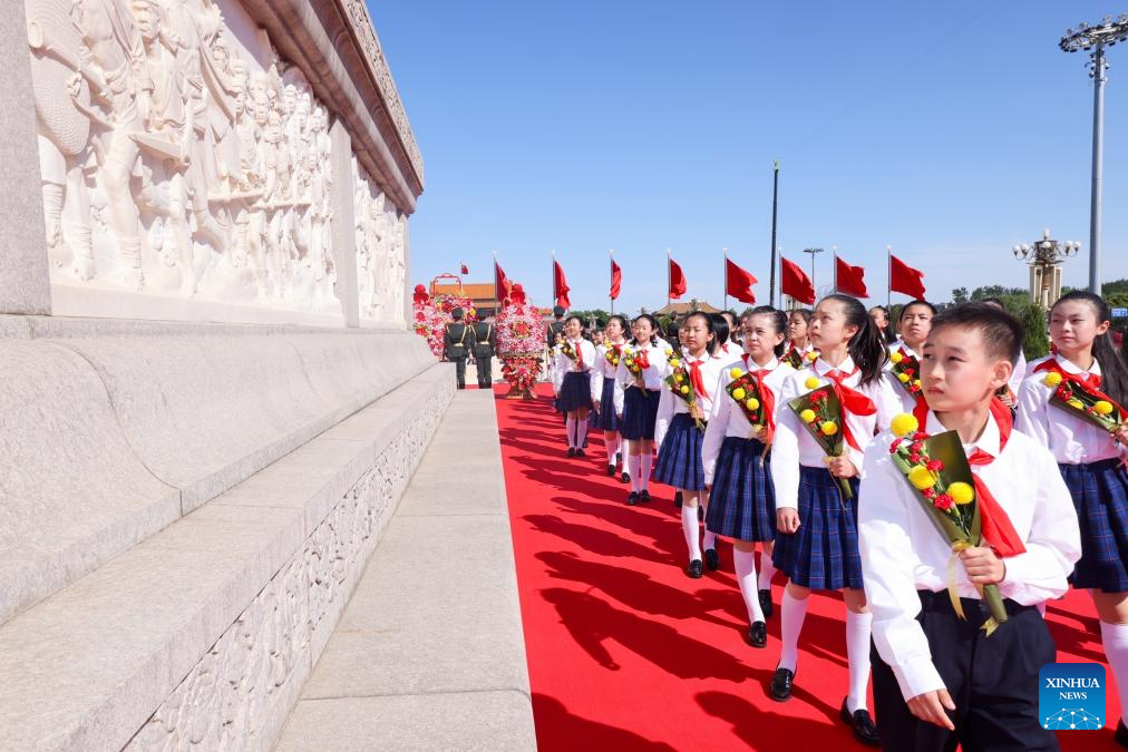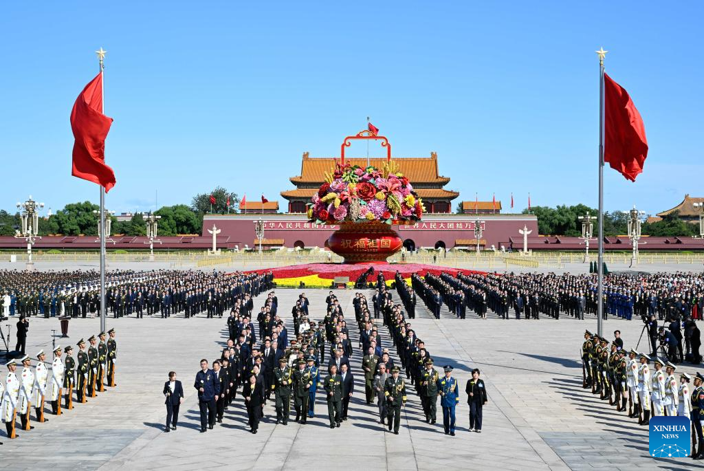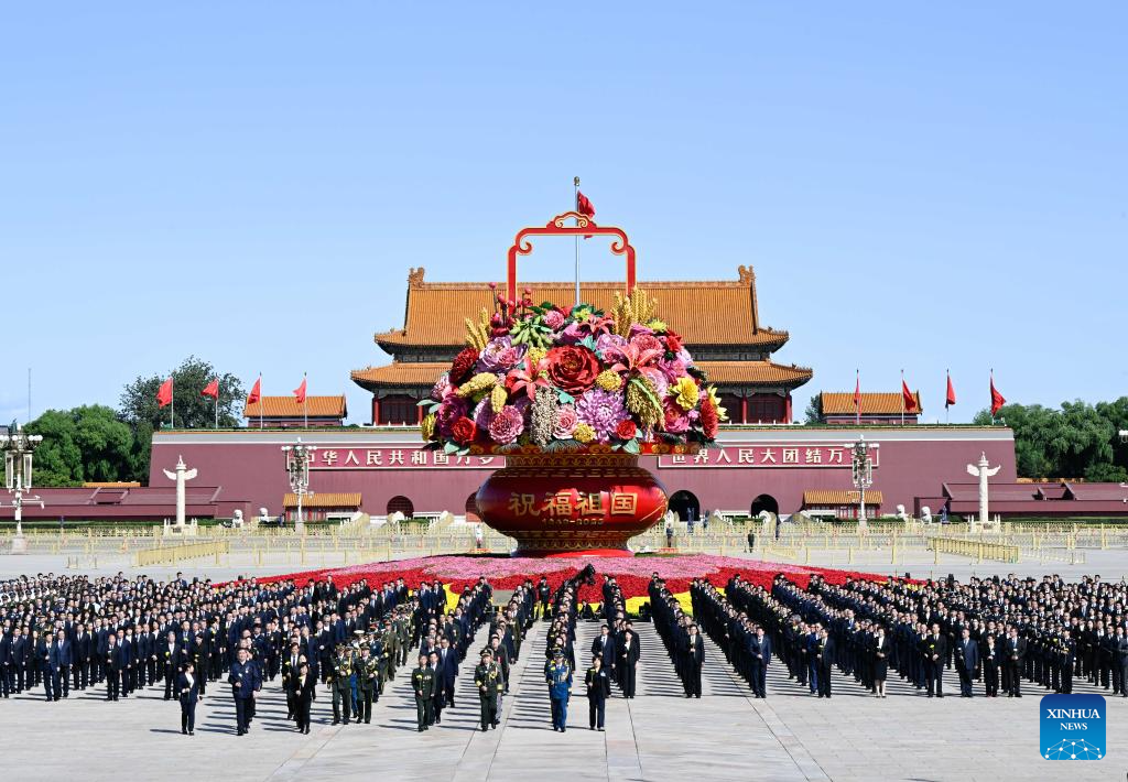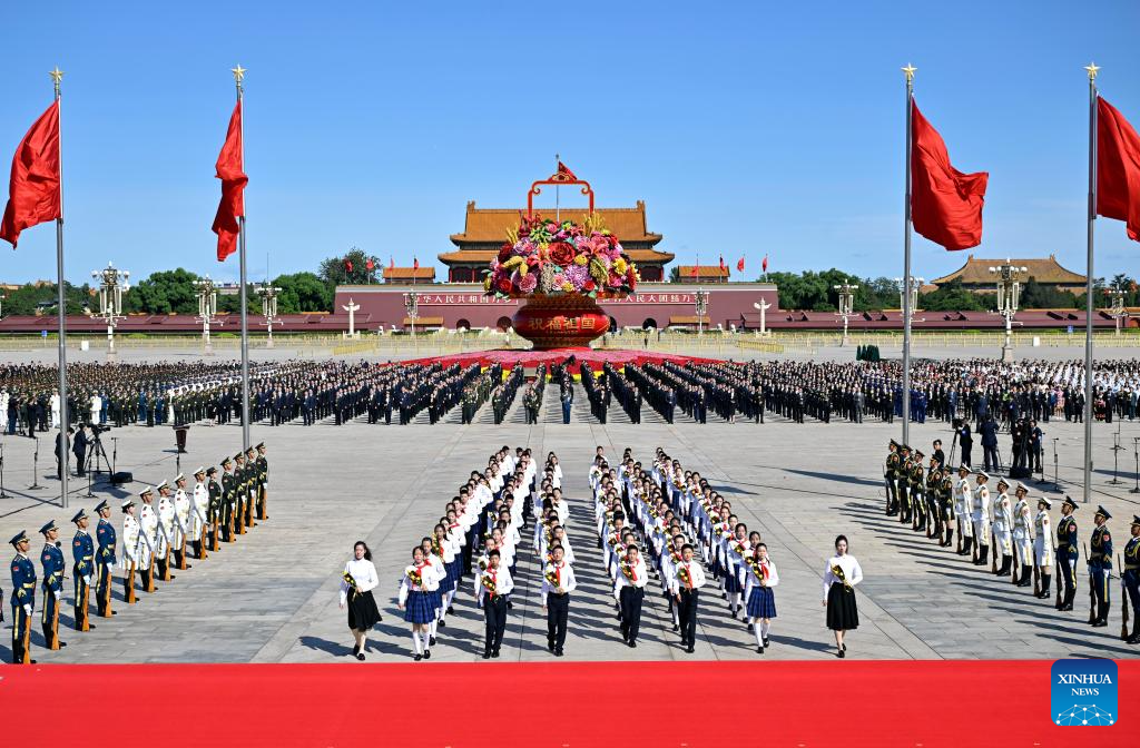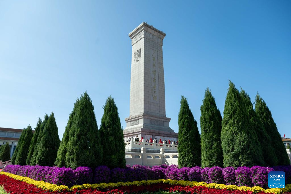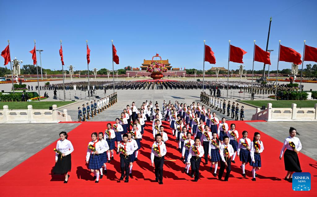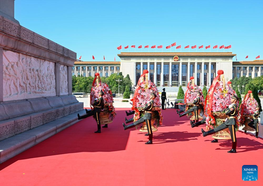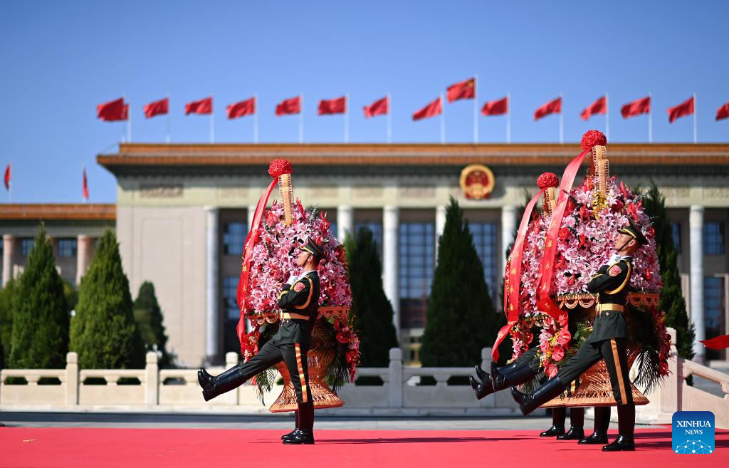 A ceremony presenting flower baskets to fallen national heroes to mark the Martyrs' Day is held in Tian'anmen Square in Beijing, capital of China, Sept. 30, 2023. (Xinhua/Yue Yuewei)