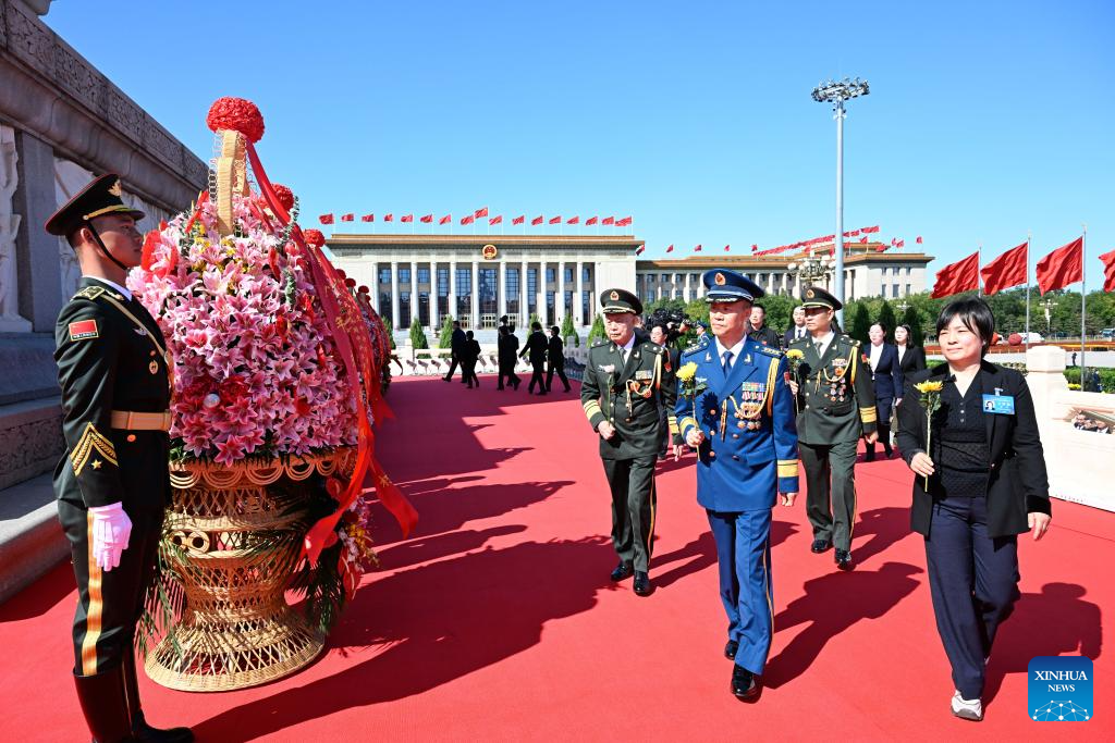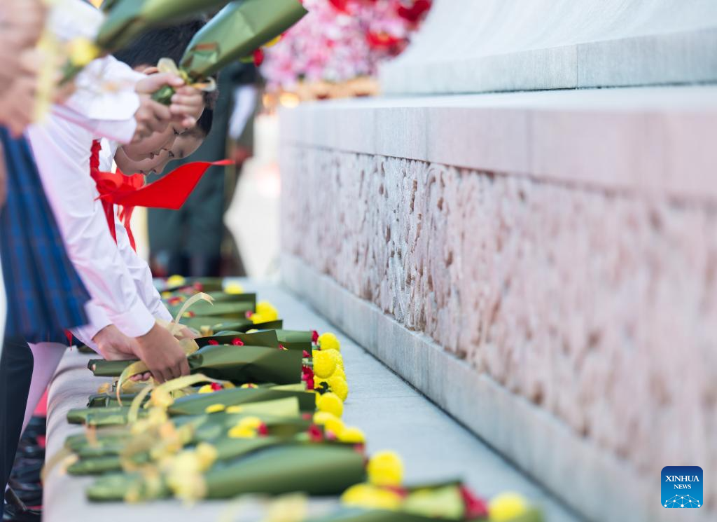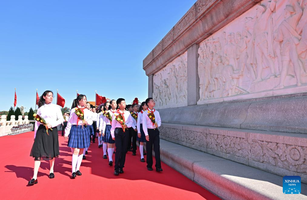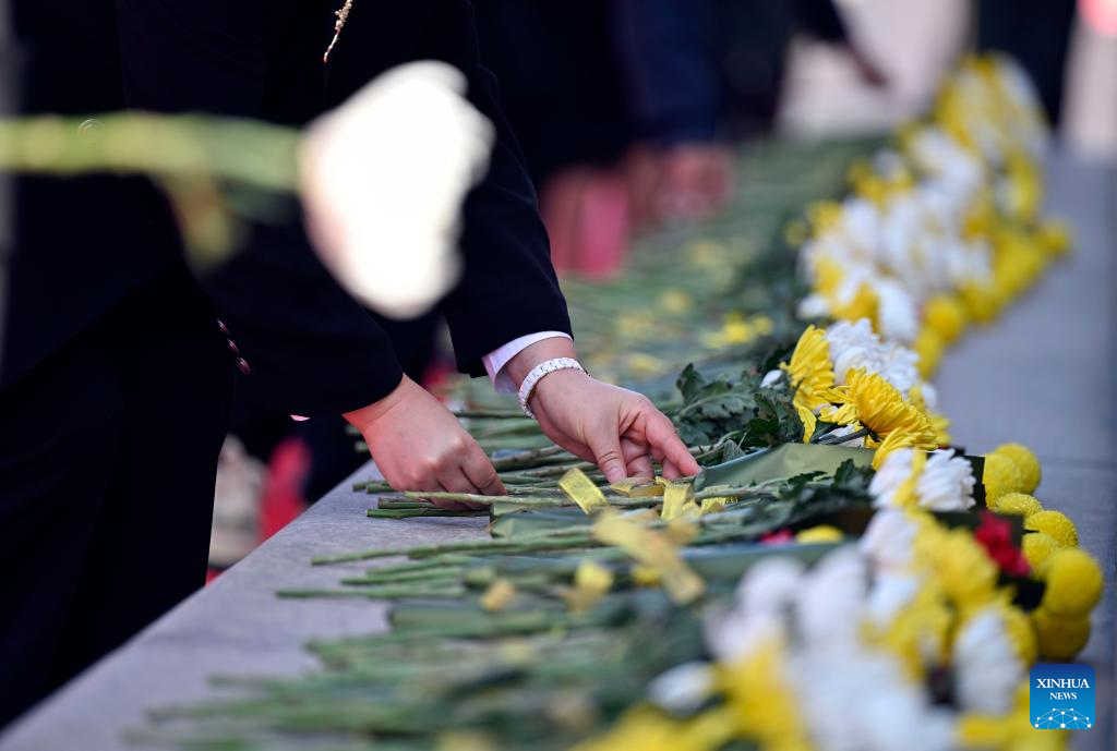 A ceremony presenting flower baskets to fallen national heroes to mark the Martyrs' Day is held in Tian'anmen Square in Beijing, capital of China, Sept. 30, 2023. (Xinhua/Zhai Jianlan)