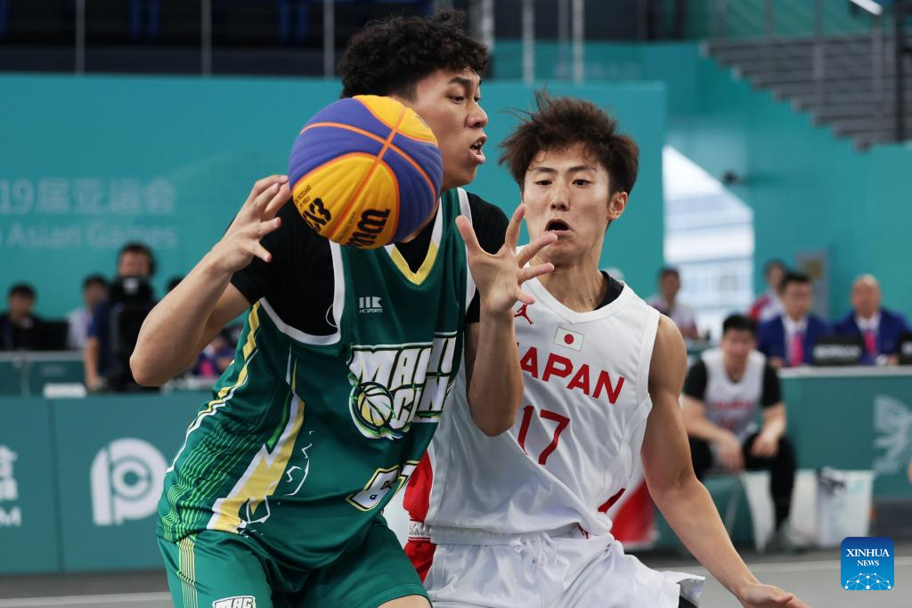 Zeng Pucheng (R) of China's Macao competes with Shimokawa Takumi of Japan during Men's Qualifications to Quarterfinal of 3X3 Basketball between Japan and China's Macao at the 19th Asian Games in Huzhou, east China's Zhejiang Province, Sept. 30, 2023. (Xinhua/Chen Bin)