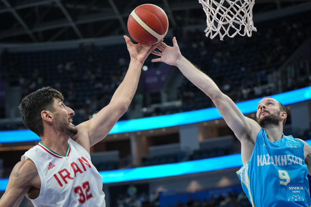 Mohammad Shahrian Nasl (1st L) of Iran competes during the Men's Preliminary Round Group match of Basketball between Iran and Kazakhstan at the 19th Asian Games in Hangzhou, east China's Zhejiang Province, Sept. 30, 2023. (Xinhua/Pan Yulong)